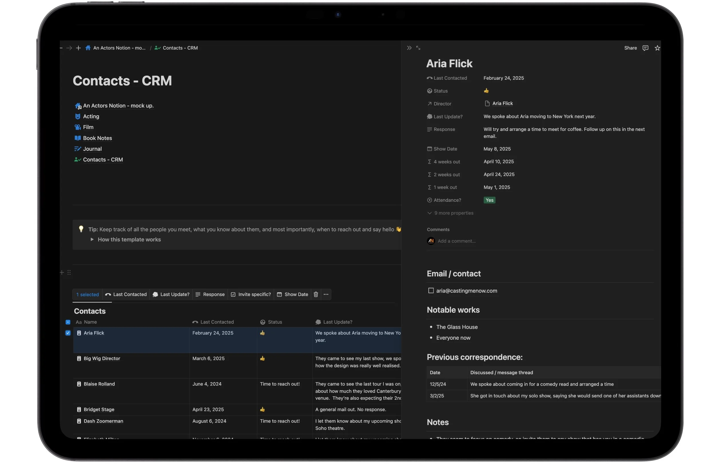 The use of everything combined within the Actors Notion system is a really handy compartmentalising tool, in an industry that can feel overwhelming. I like that it is your personal software, that you can easily open up and take action.”